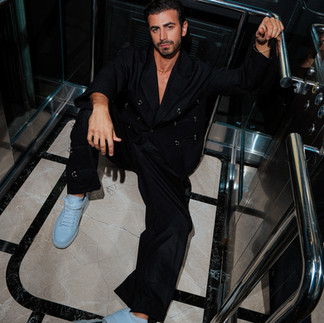 Emin Günenç'in Karizması: Emin Günenç ise derin yaka ipek gömleği ve lacivert kadife takımıyla çabasız ama son derece etkileyici bir şıklık yakalamış. Keskin yüz hatlarını ön plana çıkaran özenli, modern ve geriye doğru şekillendirilmiş saç kesimi, gecenin karanlık konseptine mükemmel bir uyum sağlıyor.